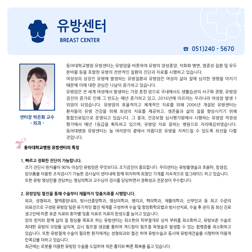 유방암, 유방양성종양, 유방질환, 유방로봇수술 [유방센터에서 진료합니다 : 051- 240 - 5670] |
