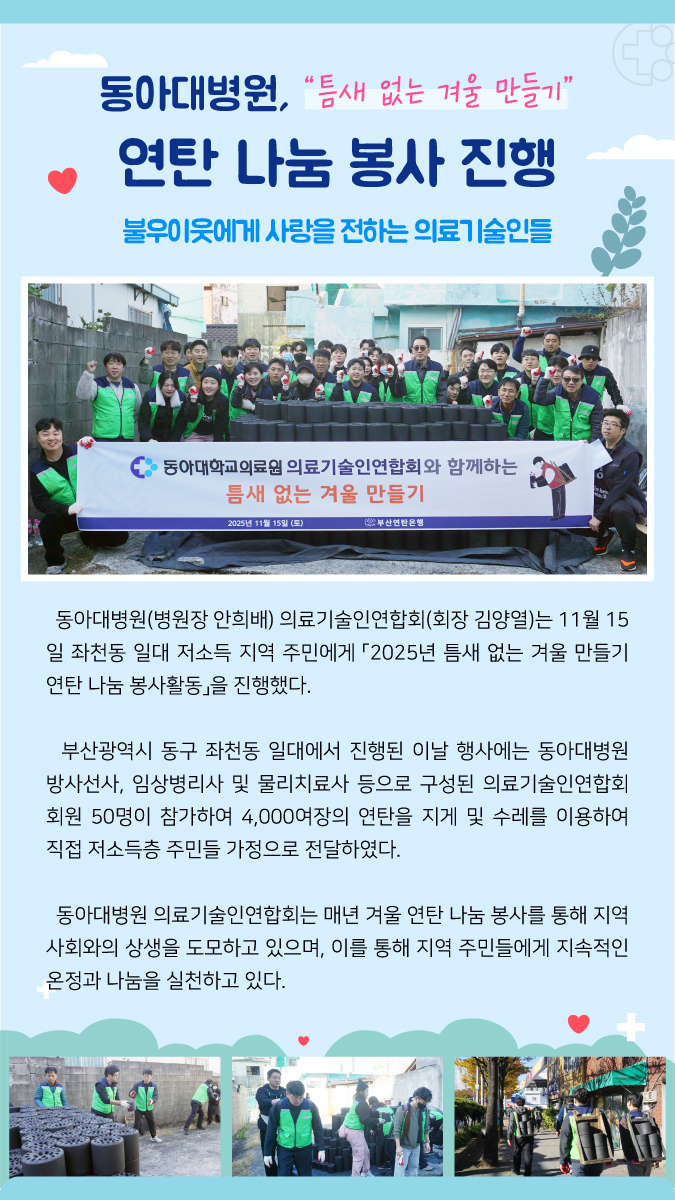 동아대병원, “틈새 없는 겨울 만들기” 연탄 나눔 봉사 진행