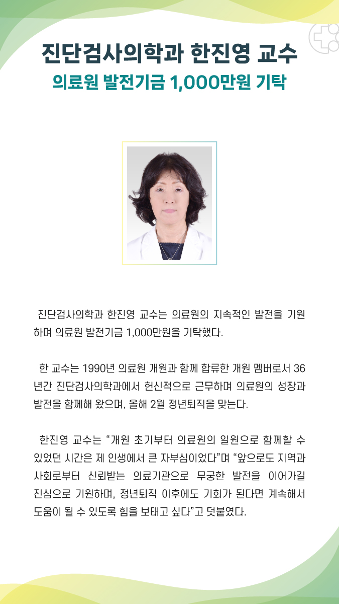 진단검사의학과 한진영 교수, 의료원 발전기금 1,000만원 기탁