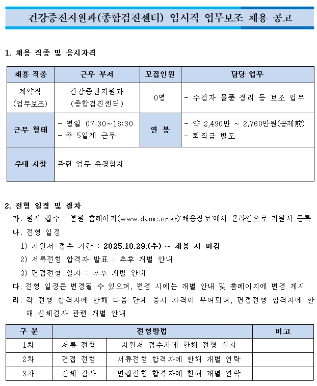 건강증진지원과(종합검진센터) 임시직 업무보조 채용 공고