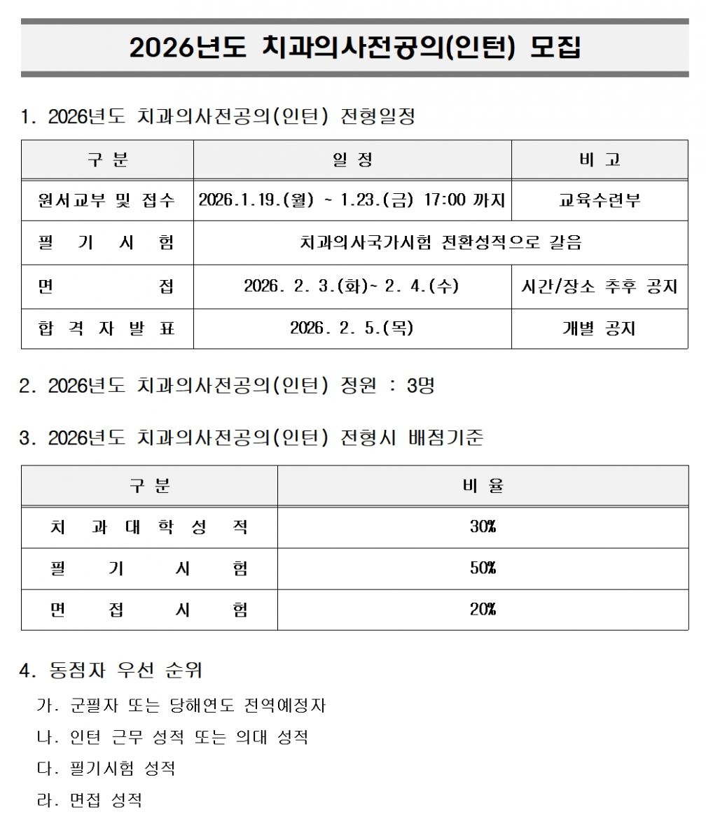 이전 2026년도 치과의사전공의(레지던트 1년차) 모집 공고