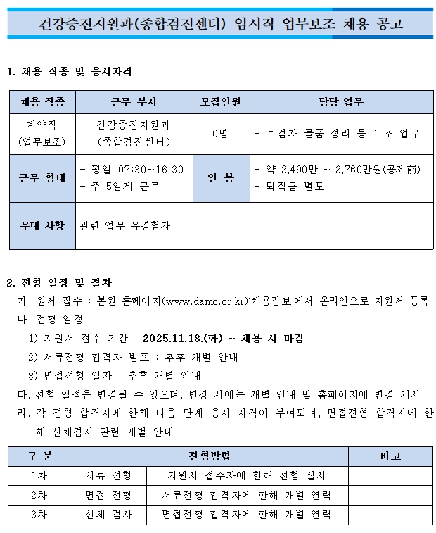 건강증진지원과(종합검진센터) 임시직 업무보조 채용 공고