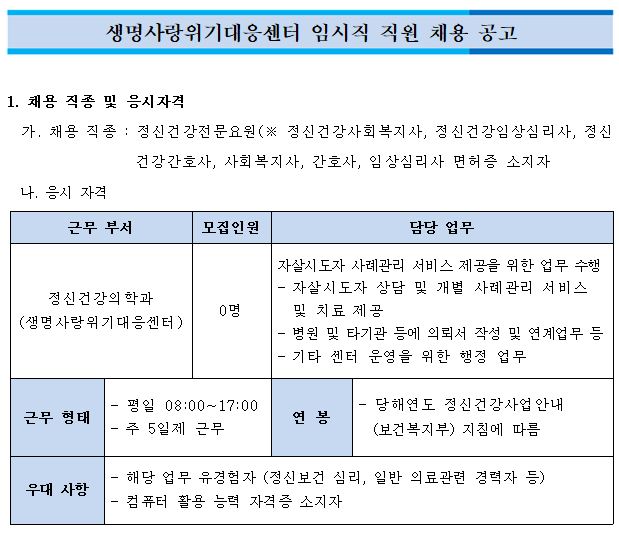 생명사랑위기대응센터 임시직 직원 채용 공고