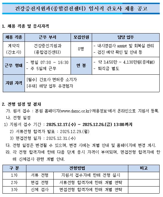 건강증진지원과(종합검진센터) 임시직 간호사 채용 공고