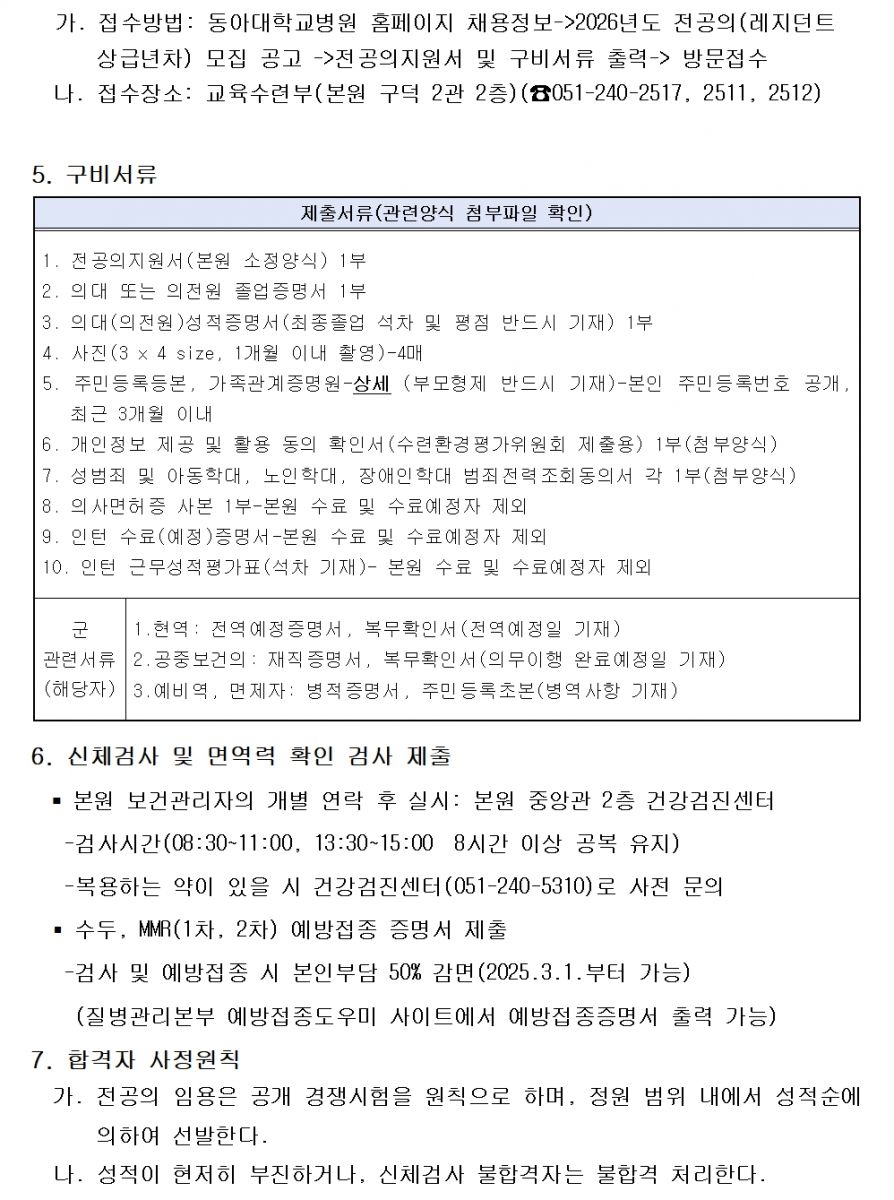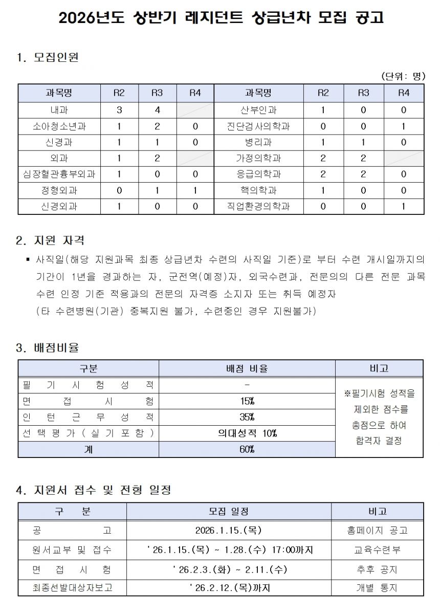 2026년도 상반기 레지던트 상급년차 모집 공고