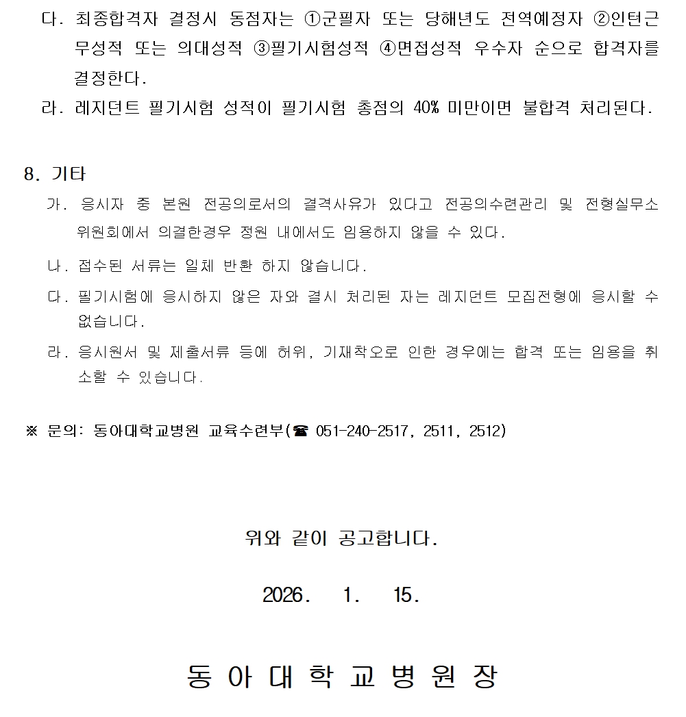 다음 2026년 동아대학교의료원 병리실 정규직 임상병리사 공개채용 서류전형 합격자 발표