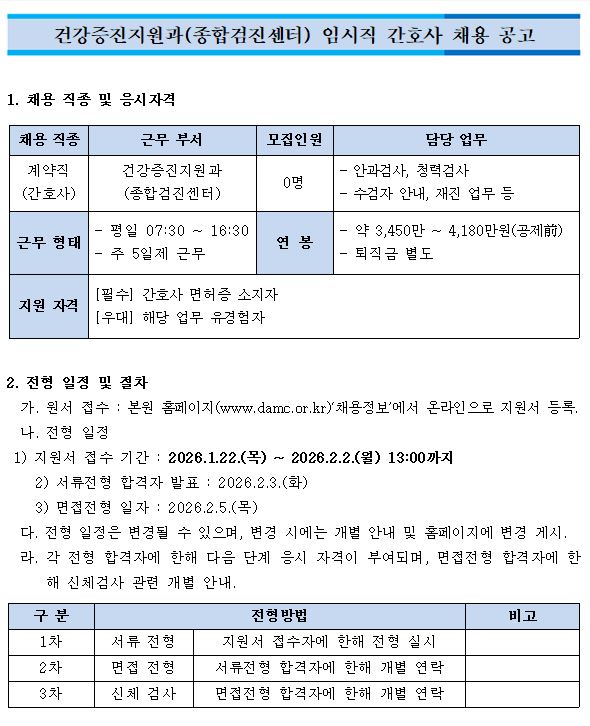 건강증진지원과(종합검진센터) 임시직 간호사 채용 공고