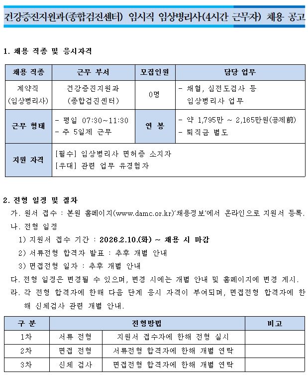 건강증진지원과(종합검진센터) 임시직 임상병리사 채용 공고