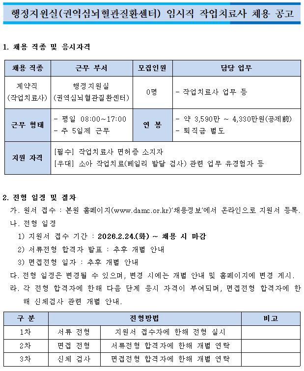 행정지원실(권역심뇌혈관질환센터) 임시직 작업치료사 공개채용 공고