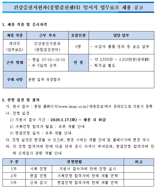 건강증진지원과(종합검진센터) 임시직 업무보조 공개채용 공고
