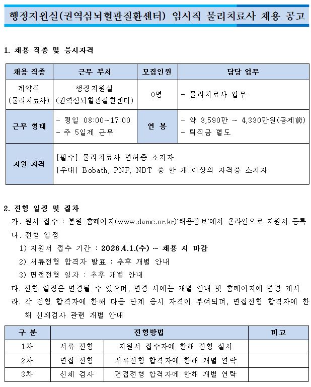 행정지원실(권역심뇌혈관질환센터) 임시직 물리치료사 공개채용 공고