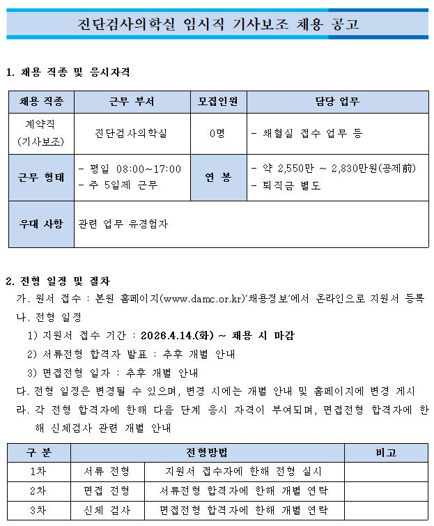 진단검사의학실 임시직 기사보조 공개채용 공고