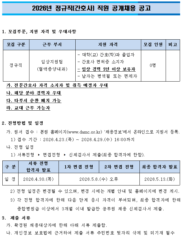 2026년 정규직(간호사/혈액종양내과) 직원 공개채용 공고