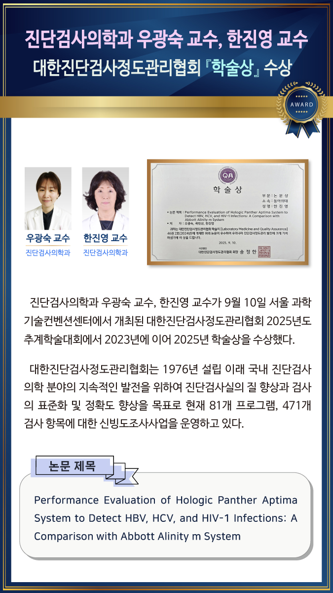 진단검사의학과 우광숙 교수, 한진영 교수 _대한진단검사정도관리협회 『학술상』 수상