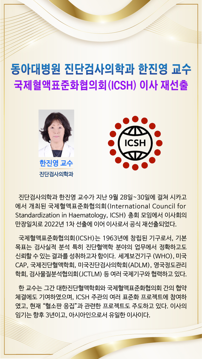 진단검사의학과 한진영 교수 _국제혈액표준화협의회(ICSH) 이사 재선출