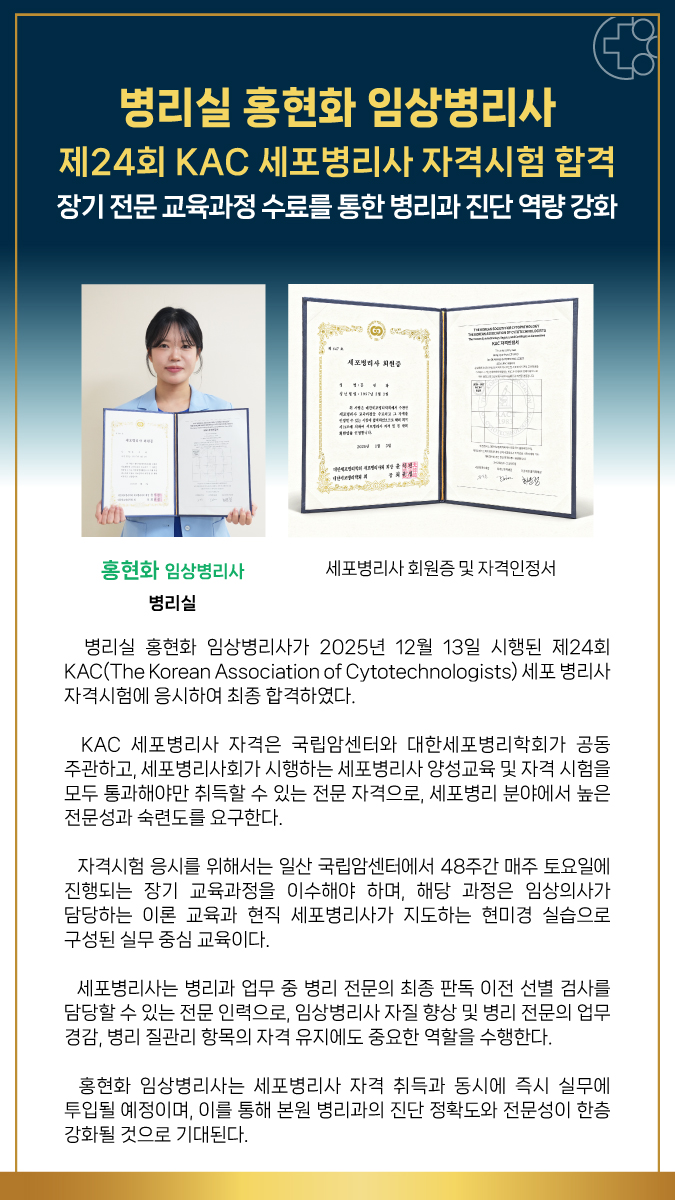 병리실 홍현화 임상병리사_제24회 KAC 세포병리사 자격시험 합격