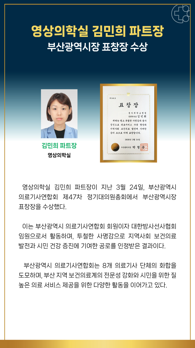 영상의학실 김민희 파트장 _부산광역시장 표창장 수상