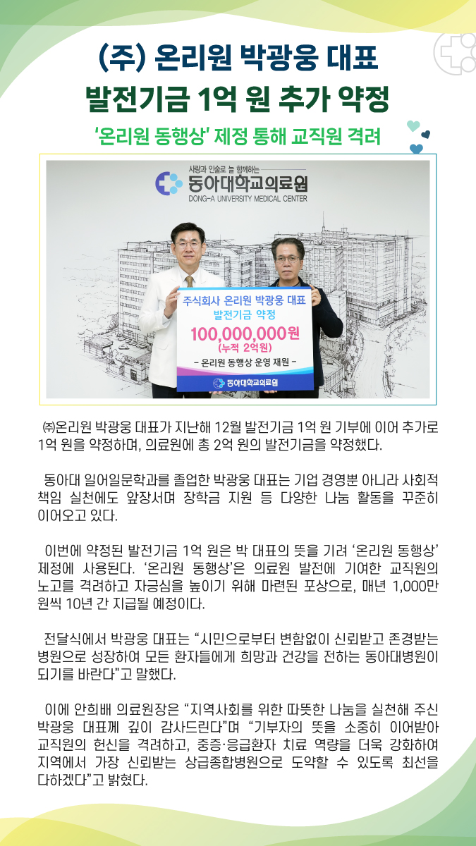 (주)온리원 박광웅 대표, 발전기금 1억 원 추가 약정