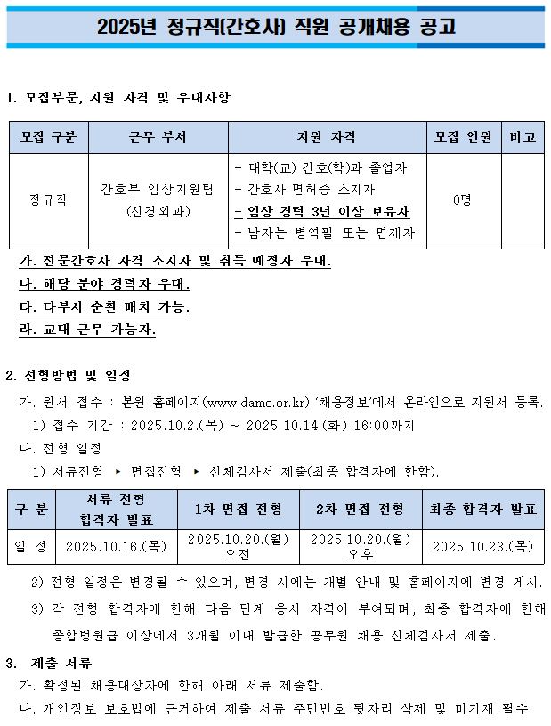 2025년 정규직(간호사/신경외과) 직원 공개채용 공고