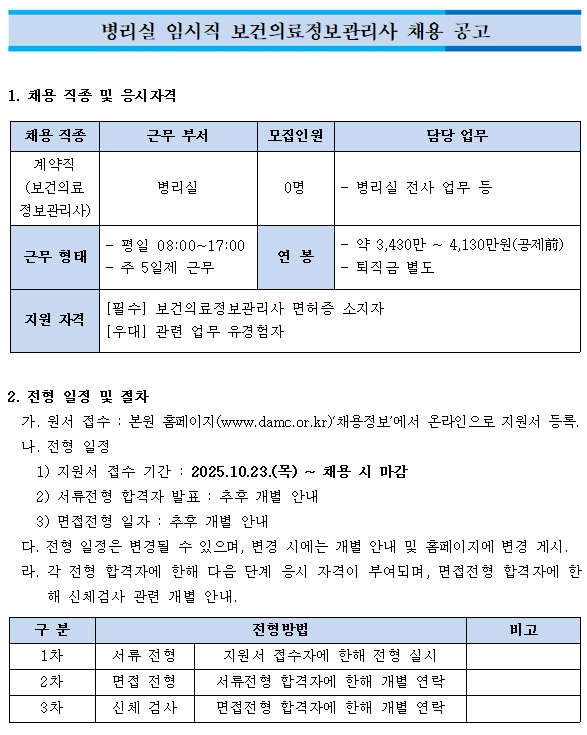 병리실 임시직 보건의료정보관리사 채용 공고
