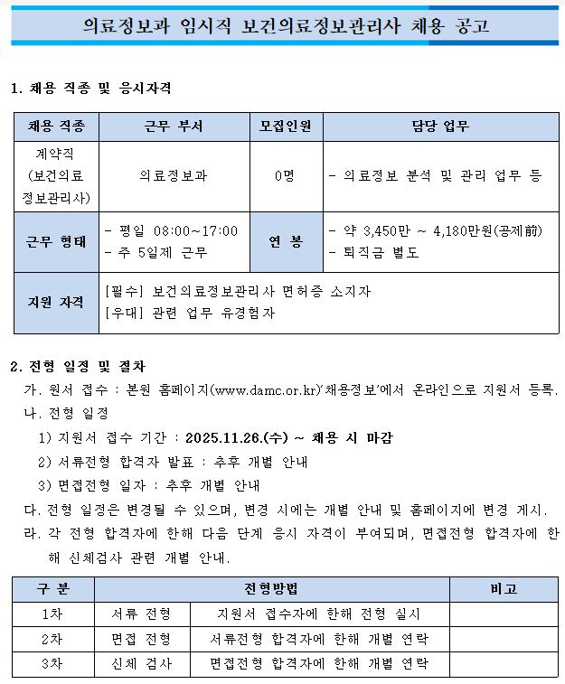 의료정보과 임시직 보건의료정보관리사 채용 공고