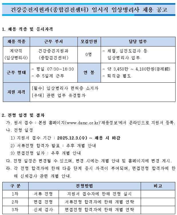 건강증진지원과(종합검진센터) 임시직 임상병리사 채용 공고