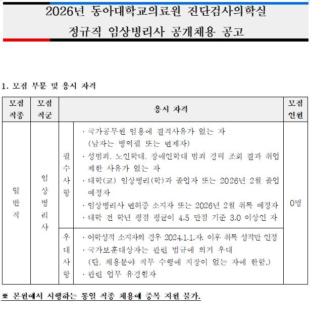 2026년 동아대학교의료원 진단검사의학실 정규직 임상병리사 공개채용 공고