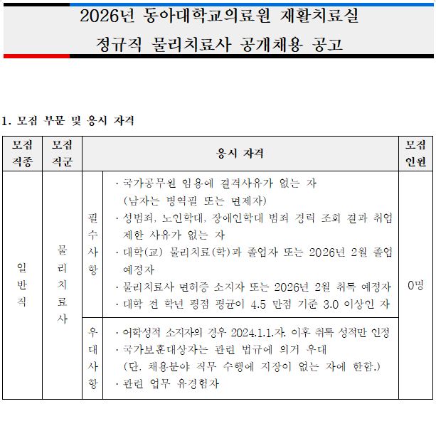 2026년 동아대학교의료원 재활치료실 정규직 물리치료사 공개채용 공고