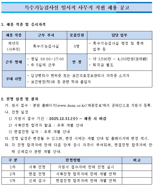 특수기능검사실 임시직 사무직 직원 채용 공고
