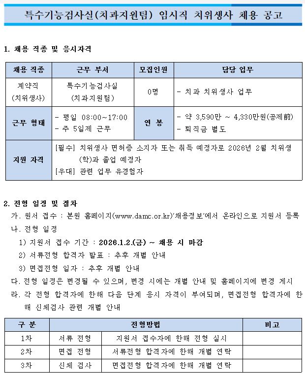 특수기능검사실(치과지원팀) 임시직 치위생사 채용 공고