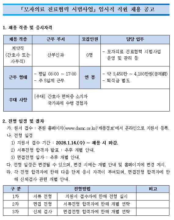 「모자의료 진료협력 시범사업」임시직 직원 채용 공고