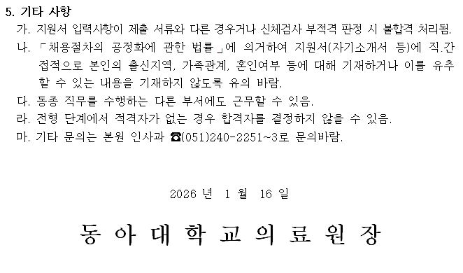 이전 2026년 동아대학교의료원 진단검사의학실 정규직 임상병리사 공개채용 서류전형 합격자 발표