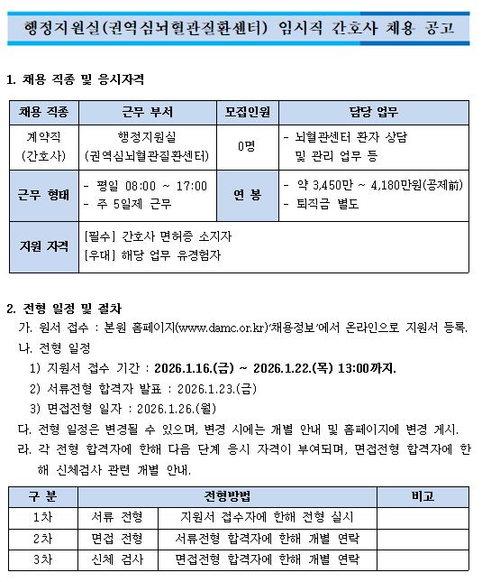행정지원실(권역심뇌혈관질환센터) 임시직 간호사 채용 공고