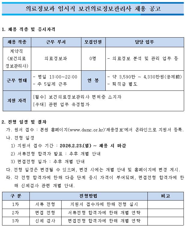 의료정보과 임시직 보건의료정보관리사 공개채용 공고