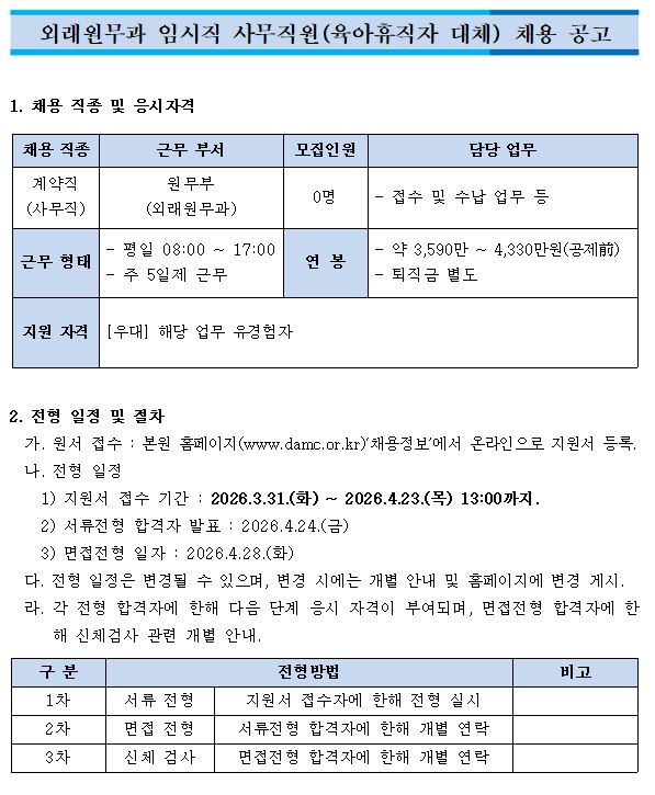 외래원무과 임시직 사무직(출산휴가 및 육아휴직자 대체) 공개채용 공고