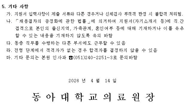 이전 2026년 동아대학교의료원 건강증진지원과 정규직 산업위생관리기사 공개채용 공고