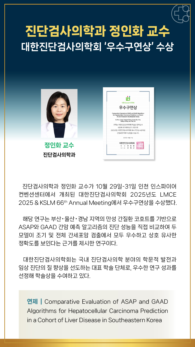 진단검사의학과 정인화 교수 _대한진단검사의학회 ‘우수구연상’ 수상
